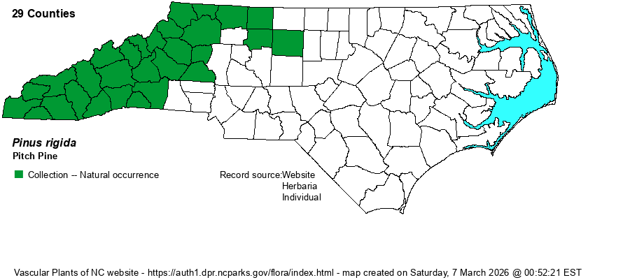 | Distribution | Throughout the Mountains, and into the western and rarely the central Piedmont; limited essentially to ridges and monadnocks in the Piedmont. Ranges east to Guilford County. An old specimen from Randolph County at NCU has been re-examined and determined to be a hybrid with Loblolly Pine (P. taeda) i.e., is P. rigida x taeda.