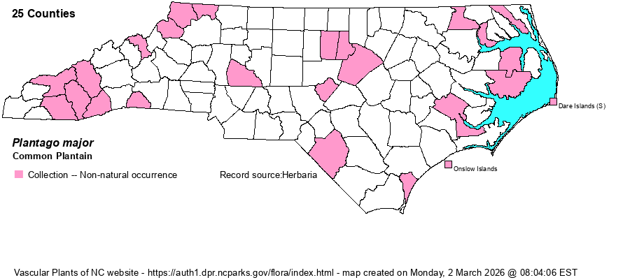| Identification | This species is typical of most plantains -- a basal rosette or group of leaves plus 1-many scapes with one flowering head per scape. In this species, the leaves are usually very broadly elliptic or ovate, with impressed ribs, and the leafstalk is entirely green or dusky. The heads are linear and long. It is very similar to the native and quite numerous P. rugelii in most respects, but that species has dull red leafstalks (as opposed to green). | |