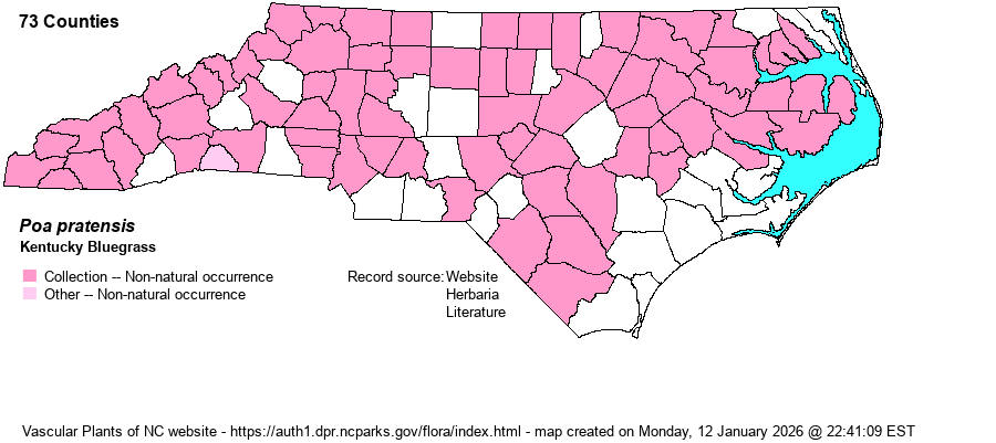 | Identification | Kentucky Bluegrass, despite its name, is not native to KY or anywhere in the southeastern U.S. Plants are perennial, rhizomatous and so are turf-forming, green or bluish green. Culms may reach 2 feet or more, with relatively open inflorescences and 2-7 branches per node. The florets have white wispy hairs at their base. The well-developed rhizomes separate it from our other bluegrasses, except P. cuspidata and P. compressa. | |
