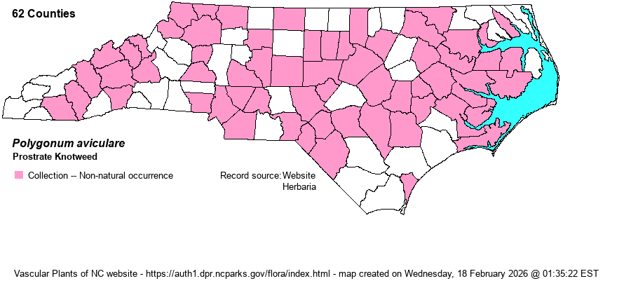 | Identification | Prostrate Knotweed is the Poster Child of a weed -- it looks like one, acts like one, grows in highly disturbed places, and not loved by anyone. The plants are prostrate to ascending (some forms may be rather erect), much branched; the leaves are narrowly lance-shaped and gray-green or plain green. Fresh ocreae (collars at the junction of the stem and leafstalk) are silvery but soon shred into fibers. The inflorescences are inconspicuous, axillary and terminal. FNA has excellent texts and maps of the various subspecies, with a key. P. glaucum of ocean beaches is a much bigger plant (but still prostrate), brighter gray-green or blue-green, and the silvery tips of the ocreae are persistent. | |
