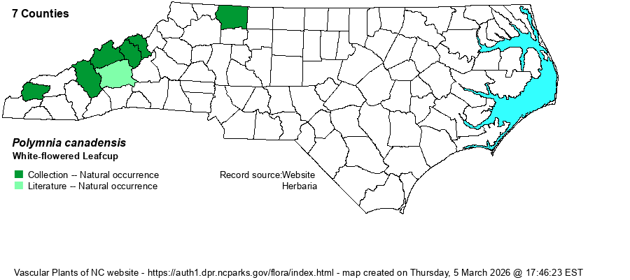 | Identification | White-flowered Leafcup is quite robust, growing up to 4 or 5 feet tall, often several stems from a rootcrown. Leaves are large (up to a foot long and 9 inches wide), pinnately and deeply lobed into 5 or so broad segments. The inflorescence is branched, terminal and usually also with a couple of flowering stalks from the upper leaf axils. Rays are white and short, or sometimes absent; disks are pale yellow. Among our composites, only Smallanthus is similar, but its rays are yellow and much longer and its leaves are palmately lobed into 3 parts. Sadly, such a tall and striking plant is very scarce in the state, not seen by most biologists, much less by the public. Though the large and strongly lobed leaves are striking, there are a few species in other genera that could resemble it (such as several Hydrophyllum and Lactuca species), and owing to its great rarity in the state, identifying the species by leaves only, without a flowering or fruiting stem, is not recommended. | |
