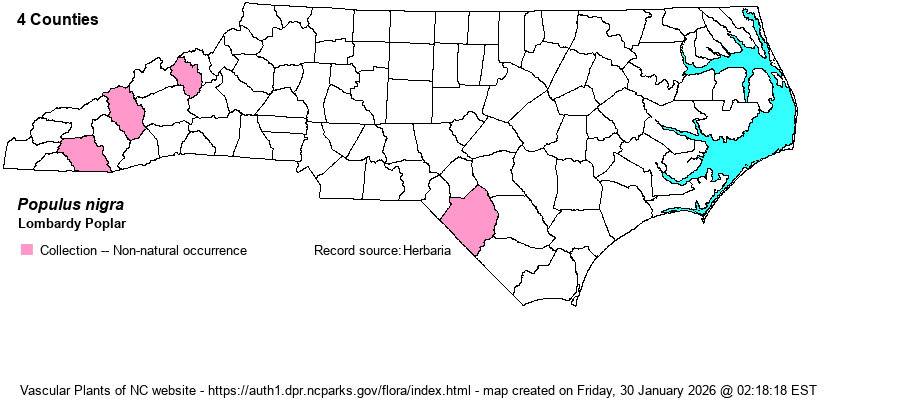 | Abundance | Very rare as an escape, though often seen planted along field margins and yard borders to act as windbreaks. Apparently our plants are all male and reproduce by root suckers. | |
