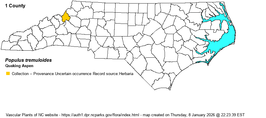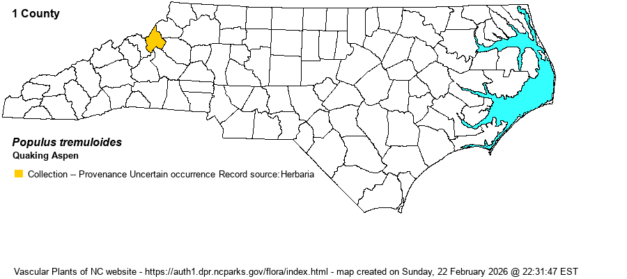 | Distribution | Known conclusively only from near the top of Grandfather Mountain in Avery County. However, as this is a considerable southern disjunction from the rest of the range (the Mountains of central VA), it is not clear if it is native to NC. At least, if a native population were to occur in NC, it should be from high and rocky elevations in the northern Mountains, where Grandfather Mountain is located and has suitable habitats. The fact that the collections came from the access road margin also gives pause to its native status. In March 2022, Sorrie reviewed all specimens in SERNEC. None of them appear to be a native occurrence: "margin of road, vicinity of tower, Grandfather Mtn."; "1.7 miles S of Linville, vicinity of Gardens of Blue Ridge". Interestingly, another Avery Co. specimen was taken in 1971 from a "nursery" in nearby Pineola. Henderson County specimens, all from the French Broad River, are labeled/annotated as tremuloides, grandidentata and a hybrid between the two.