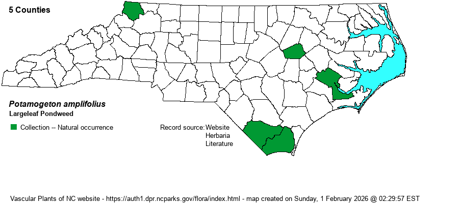 | Distribution | Widely scattered in the Coastal Plain, known from 4 counties there. Also a collection in the northern Mountains (Ashe County), but it needs careful ID. A specimen from Wilson County, reported by USDA, is AWOL. Could potentially occur nearly statewide. Members of the genus and most other aquatic species tend to be under-collected.