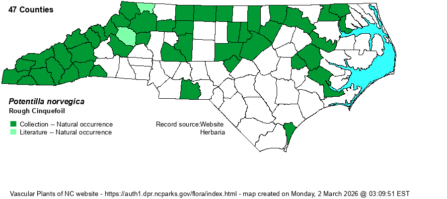 | Habitat | This Potentilla favors moist to damp ground, though still mostly in weedy habitats as in the other two native species. It grows in openings in bottomlands or along stream margins, moist fields and meadows, on sand bars, and other disturbed places. | |