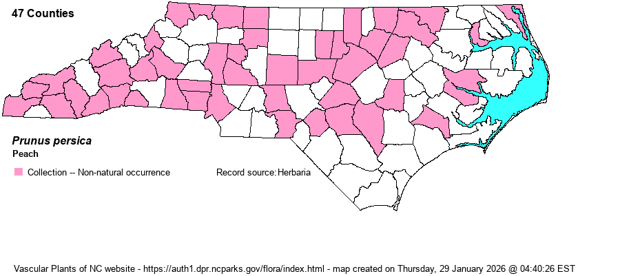 | Abundance | Fairly common in most of the state, but rare in the Coastal Plain. Website editors wonder if most NC records are of persisting trees, rather than actual established/reproducing plants. | |