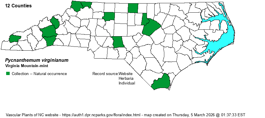 | Identification | This is one of the several narrow-leaved mountain-mints in the state, and owing to its rarity, must be carefully separated from the quite common P. tenuifolium, and less so from P. flexuosum. It grows to about 2.5 feet tall, with branches in the upper portions, as with most others in the genus. In this species, the stem is strongly 4-sided, with hairs on the edges and at times on the sides; P. tenuifolium is glabrous and often has a somewhat rounded stem. The very numerous pairs of opposite leaves average about 2 inches long and about 1/4-inch wide (3-10 mm), whereas those of P. tenuifolium are generally 1/8-inch (3 mm at best) wide or narrower. Otherwise, it has numerous small heads at the tops of the upper branches, each with a group of small white flowers; the clusters are more unevenly spaced on the plant and not anywhere resembling a flat-topped look as often seen in P. tenuifolium; in addition, the flowers are slightly larger than in that species, creating more of a spectacle when a group is in bloom. P. flexuosum is a whitish-looking plant, with an abundance of white hairs over the plant. This rare species is difficult to find in NC, though as it can be passed over as P. tenuifolium and has a wide range in the state, there seems to be plenty of opportunity for new populations to be found in the mountains and northern Piedmont. | |