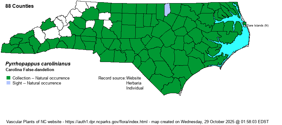 | Identification | As its name suggests, Carolina False-dandelion has heads and leaves that resemble Common Dandelion. But it can easily be told by its much taller stem -- 1-2.5 (or more) feet, each head flat-topped (vs. rather dome-shaped), and presence of several stem leaves (vs. none). Hairy Cat's-ear (Hypochaeris radicata) is similar, but its heads are deeper yellow and it lacks stem leaves. This native species has bright canary yellow heads that are less "golden" in color than are those of the two exotic species. It is a showy plant, owing partly to its height but also to its lighter yellow flowers. Most people would assume this is just another non-native "dandelion", especially as it is always found in man-influenced habitats. | |