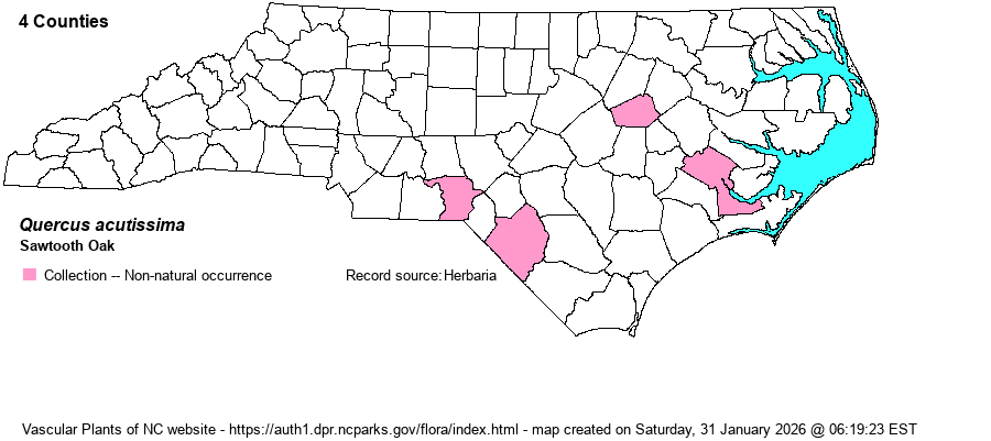 | Identification | Sawtooth Oak can be a large tree, but escapes from cultivation are likely to be saplings. Leaves are narrowly elliptical and taper to a sharp or blunt tip, and the margins have many teeth with bristle tips. Acorns have rough cup scales that are recurved or twisted in various ways. The nut is short. The leaves look somewhat like those of the native Chinquapin Oak (Q. muehlenbergii) but are not as deeply toothed. | |