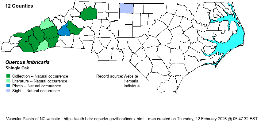 | Identification | Unless you spend much time in the Midwest, or in some floodplains in the southern mountains, this tree is likely unfamiliar. It is a medium deciduous tree, growing mainly to about 60-65 feet tall. It can really only be confused with Willow Oak (Q. phellos) and a hybrid -– Willow x Blackjack. Shingle Oak leaves are widely elliptic, about 5 inches long and about 1.5 inches wide, generally much wider than those of Willow Oak. The leaves are also quite shiny above; though the margins are entire, they can be a bit wavy-looking (i.e., the leaf isn’t quite flat). The Willow x Blackjack hybrid does occur in the Piedmont, and it is not rare there. However, the hybrid has glabrous leaves below, whereas Shingle Oak leaves are quite tomentose and pale below. Thus, when you see an oak with widely elliptic leaves but is unlobed, check the undersides to make sure they are pale and quite hairy before you claim a Shingle Oak. [Note that a great number of trees have the “standard” elliptical leaves with no serrations, so it is assumed that you can figure out a tree is an oak by the multiple terminal buds, or presence of acorns on the trees or the ground, etc.]. | |