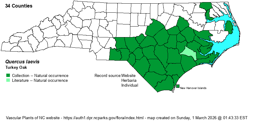 | Abundance | Very common to often abundant in the southern half of the Coastal Plain, in areas where Longleaf Pine (Pinus palustris) is present -– the Sandhills region and the southern counties from Croatan National Forest (Craven) south to the SC state line. Generally fairly common to locally common in the central Coastal Plain, but uncommon and local northward. Very rare in the Piedmont portion of the range. The most numerous of the “scrub oak” species of sandy soil in the state. | |