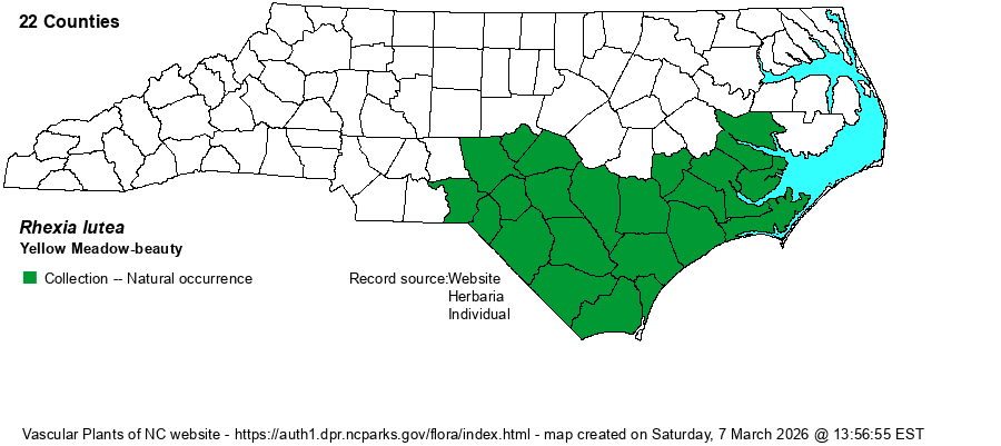 | Identification | This is the only yellow-flowered Rhexia, which would seemingly make it obvious to identify. However, at some distance, one or two Oenothera species can look like it in flower, and if not in bloom, it might be tricky to identify. It is normally a hairy species, with a much-branched stem, growing to 1-1.5 feet tall. The paired stem leaves are quite variable in shape, but are often narrow, 3-nerved, and mostly oblong, elliptic, to nearly linear, about 2 inches long and usually 1/4-inch wide or less. The flowers from the branch tips and upper axils are quite spectacular and are not normally just a medium yellow but are a rich, golden-yellow, with the 4 rounded but irregular petals having a spread flower about 1-inch across, usually a bit smaller than in many rose-flowered species. This species has a rather short/small capsule, generally smooth and with a quite short neck. Do not try to identify the species when not in bloom, just from the leaves and stem, but the short capsule with a narrow neck might help you identify it. Of course, when seen in bloom, with the bright golden-yellow flowers, no guesswork is needed; Oenothera flowers can be bright yellow, but they have no hypanthium behind the petals, and the leaves are alternate on the stem. | |