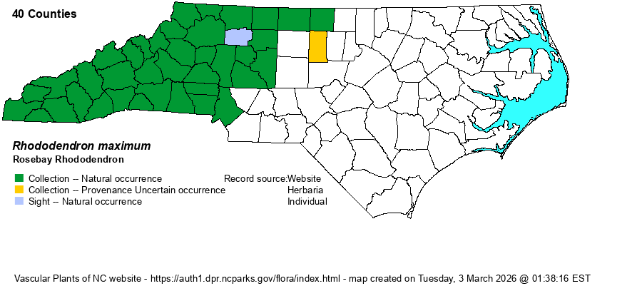| Abundance | Very common to abundant in the Mountains and foothills. Mostly uncommon in the central Piedmont, often limited to cool, north-facing slopes and bluffs. Interestingly, it does not occur close to the Fall Line, whereas the normally higher-ranging Catawba Rhododendron (R. catawbiense) has disjunct populations in this warmer and lower region of the state. | |