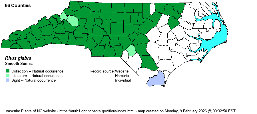 | Abundance | In the Mountains and Piedmont, it is fairly common to common, though much less numerous than is Rhus copallinum. Generally rare to uncommon in the Coastal Plain portion of the range. It is typically not seen by the biologist on a daily basis, as is the latter species. | |
