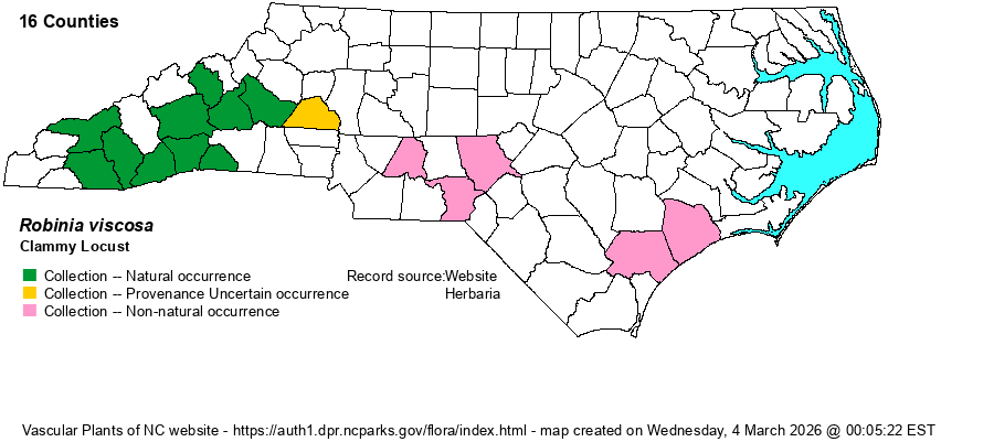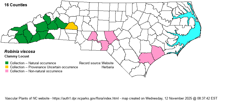 | Identification | This is a large shrub to small deciduous tree, often to 10-15 feet tall, rarely taller. It has 11-25 leaflets and thus is quite similar to other locusts in overall appearance, though it has pink to pale pink flowers. The very similar R. hartwigii, often considered as a variety of R. viscosa, is quite similar but usually is shorter in stature, often has richer pink to rose colored flowers, and is typically not quite as sticky or “clammy” on the twigs and inflorescence. See technical keys for identification. Generally speaking, a tall shrub or small tree locust species, with quite sticky twigs, will be this species if found along a roadbank, forest clearing, or other disturbed area not on the top of a granitic dome. | |