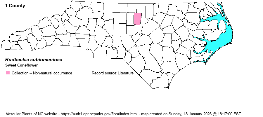 | Distribution | SERNEC contains an 1897 record from Hollow Rock, Orange County, which we tentatively treat as an escaped population. SERNEC records from Wake County are from an arboretum and are thus not mapped.