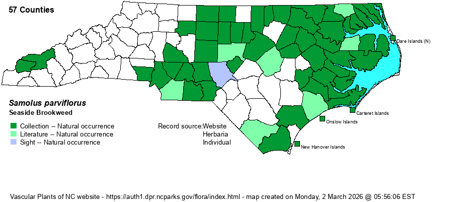 | Taxonomic Comments | Though it has always been in Samolus, some references, even today, list it as S. valerandi ssp. parviflorus. S. valerandi is a European taxon, and thus some botanists consider our plants in North America only as a subspecies. Most, however, do give it species status, as S. parviflorus.