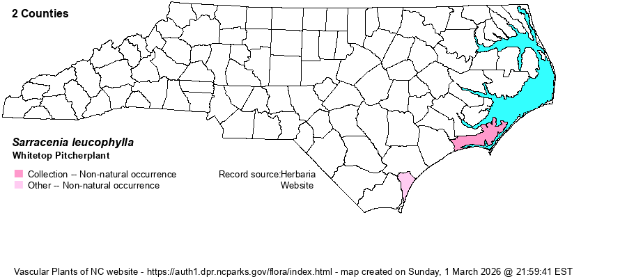 | Identification | This carnivorous plant is unmistakable with its 2-foot tall reddish-green to green trumpet-like tubes whose upper end and hood are bright white with red veins. The structurally similar S. flava, a native species in NC, has the tubes all green or yellow-green, often with reddish coloration on the upper ends. | |