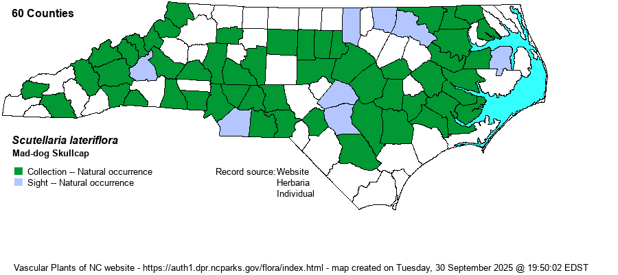 Phenology | A fairly late-blooming Scutellaria, from July to frost, and fruits soon after flowering. | |