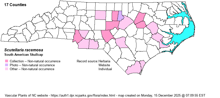 | Distribution | Scattered in the Piedmont and Coastal Plain, and in 2020 (Facebook photo) from the southern coast (New Hanover County). First collected in 2000 as a nursery weed in Chatham County, then in 2001 in landscaping material in a yard in Mecklenburg County; subsequently in 2006, 2007, 2016, and 2020. Spreading greatly, with many iNaturalist photos in 2023-24.