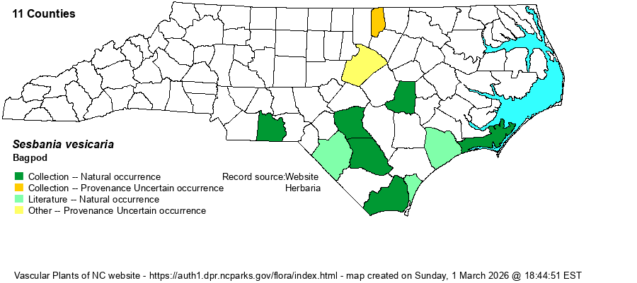 | Taxonomic Comments | Many or most references, at least several decades ago, named this species as Glottidium vesicarium. There seems to be near universal agreement that it belongs now in the genus Sesbania.