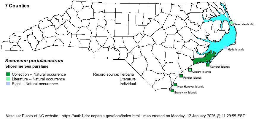 | Identification | This is a prostrate species, rooting at the nodes, and forming mats. The opposite leaves are fleshy, oblanceolate to spatulate, about 1-inch long and about 1/3-inch wide. The flowers are singly in leaf axils, with 5 bright pink triangular sepals, but no petals. The spread flower is about 1/3-inch across. This species is similar to S. maritimum, but that one, which grows in similar coastal habitats, has sessile flowers (as opposed to flowers on short stalks in S. portulacastrum), a somewhat erect to leaning stem, and the stem does not root at nodes (and thus does not form mats on sand or mud). S. maritimum usually has a white, or pale pink flower, not as richly colored as that of S. portulacastrum. That species also has 2-3 styles per flower, as opposed to 5 styles in S. portulacastrum. Take great care in separating these two, as each is scarce to rare in NC. | |
