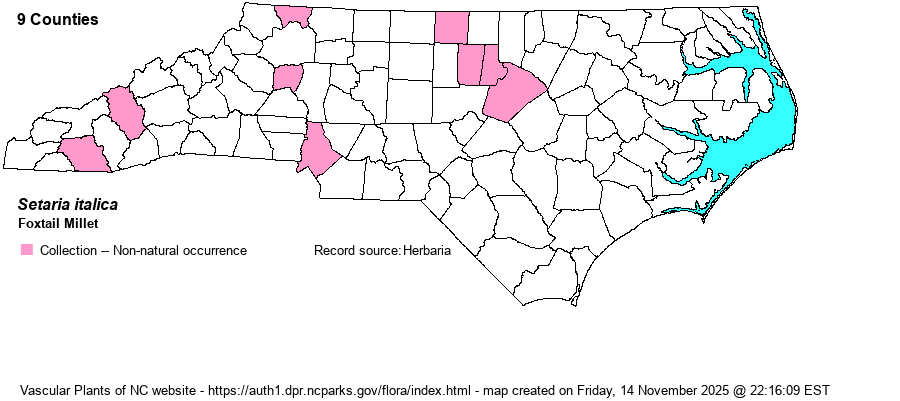 | Distribution | Scattered in the Piedmont and Mountains. It is unsure whether the Alleghany County record is from escaped plants or planted ones.