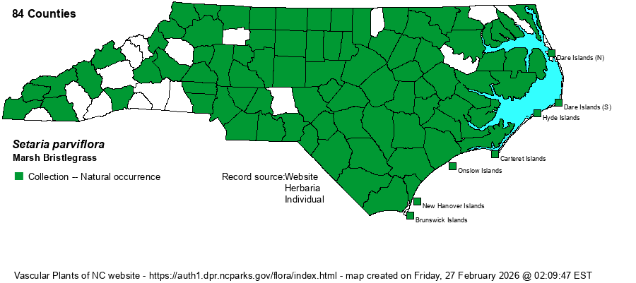 | Identification | The inflorescence of this common species looks ghostly due to the pale straw color of the bristles, almost whitish in color. The bristles are numerous (4-9 per spikelet) compared with 1-3 bristles per spikelet in Coastal Bristlegrass (S. corrugata). Like that species, the height of the stems is about 1-2 feet tall. | |