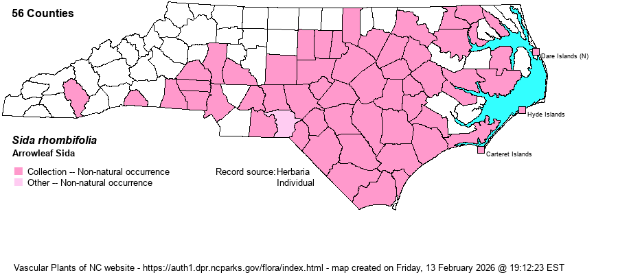 | Identification | Arrowleaf Sida is a weedy herb or sub-shrub with a stiff stem to 3 feet tall. Leaves are somewhat rhombic, 1.5-3.5 inches long and stellate-pubescent beneath (sometimes also above), the margins blunt-toothed. The flowers grow in leaf axils on stalks that are shorter than the leaf length; the petals are dull yellow, 7-9 mm long, the upper half of each petal bent clockwise. The also common alien S. spinosa is similar but has a spine below each leaf, and the narrower leaves are usually truncate at the base as opposed to more rounded or cuneate. | |
