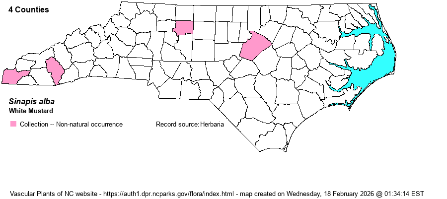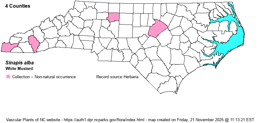 | Identification | White Mustard may reach 3 feet tall or more, but will also flower when much shorter. The stems are hispid/hairy. The basal leaves are oblong or ovate in outline, the margins lyrate to pinnatisect. The middle and upper stem leaves vary from merely toothed to having a few small lobes. The flowers are pale to bright yellow. The pods are rather constricted between the seeds, hispid, and with a long, compressed beak. S. arvensis differs in its smooth pods that are not compressed. | |