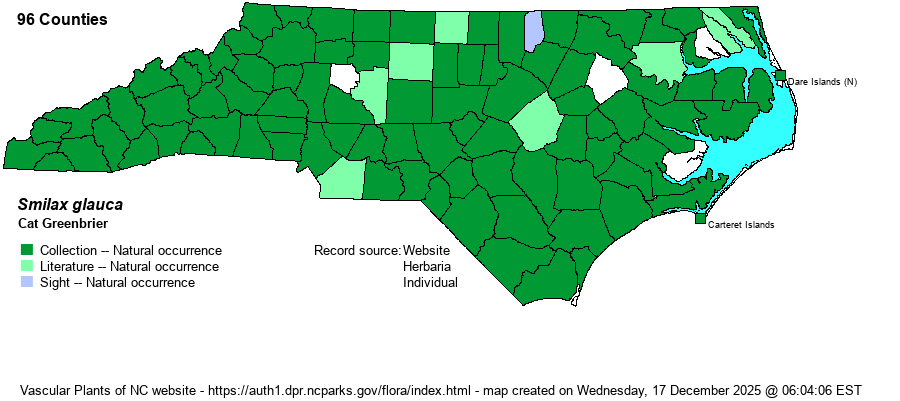 | Other Common Name(s) | Whiteleaf Greenbrier (definitely a more helpful and descriptive name), Glaucous-leaf Greenbrier, Catbrier | |