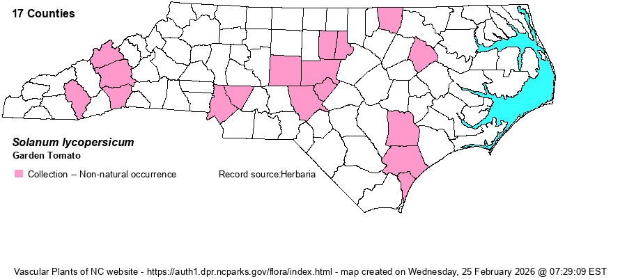 | Identification | The Garden Tomato is our familiar food plant and thus needs no description. Flowers are yellow, and unlike Physalis and yellow-flowered Solanum, the corolla is much smaller and petals separate for 2/3 their length. Remember that the edible portion is the fruit of the plant -- thus the tomato is botanically considered a fruit, and not a vegetable. | |