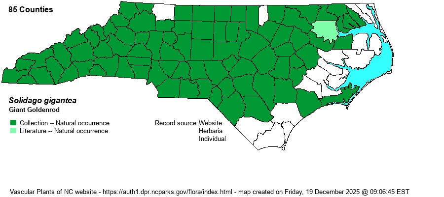 AbundanceCommon across the state, other than the outer Coastal Plain, where rare and local. Can be locally abundant, but not nearly as abundant as is the similar-looking Tall Goldenrod (S. altissima).
