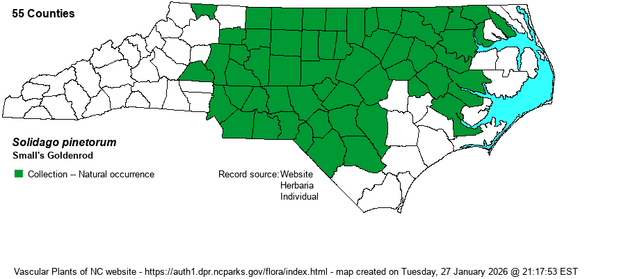 | Identification | Small's Goldenrod is one of our earliest flowering goldenrod species, beginning in late June and generally in full flower after the Fourth of July. It is a slender species and its narrow, strongly arcing/curved, stem leaves attract attention. Stem leaves also have tufts of tiny leaves in axils. Lower stem and basal leaves are linear to narrowly lance-shape, untoothed, and straight or slightly curved. The inflorescence is rather triangular in shape. In SERNEC a number of specimens of S. juncea are misidentified and actually belong to pinetorum. The former is a much taller plant with broadly elliptical basal leaves. Biologists should be very familiar with this species in the Piedmont and most of the Coastal Plain, noted for its numerous quite narrow leaves. | |