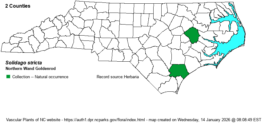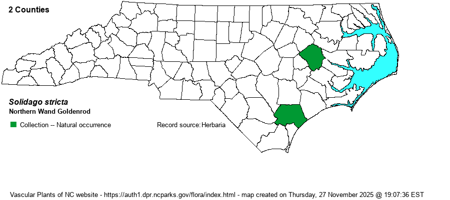| Distribution | Weakley (2018) indicates that nearly all of the records previously considered as Solidago stricta are now assignable to the newly split Solidago virgata, which see. In the (controversial) revision paper of this group, Semple et al. (2016) cite NC specimens only from Pender and Pitt counties. Until botanists come to some consensus on stricta/virgata, the website editors remain cautious, and know that the range on the map below has little real biological meaning.