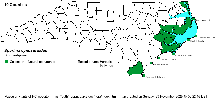 | Identification | This is by far our tallest member of the genus, the stems reportedly up 11 feet (FNA), but most often 5-8 feet tall in NC. The leaves usually grow 2-3 feet long and are long-tapered. Inflorescences are terminal and about a foot long, with many spreading to ascending branches. Its height carries it above other marsh plants except Common Reed (Phragmites australis). That alien species can grow with it and often out-competes it; they can be easily confused by inexperienced people, though Phragmites has a much bushier/denser inflorescence, darker green leaves, and leaves angling off the stem (as opposed to generally erect/ascending leaves in Big Cordgrass). | |