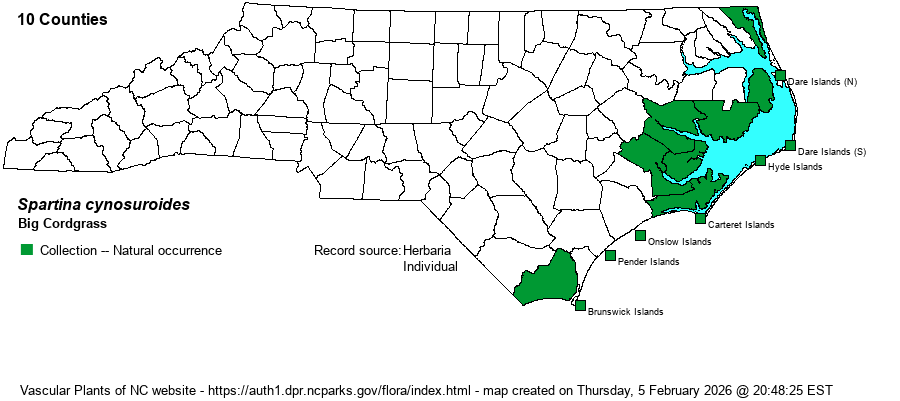| Abundance | Uncommon to locally abundant; usually forms monospecific patches or strings along tidal channels. The NCNHP considers this as S5, but it is not overly common, at least as compared with the other two coastal members of the genus -- S. alterniflorus and S. patens -- each of which is certainly common and widespread and deserving of an S5 rank. The website editors do not recommend a rank of S4, but that may be a more truthful rank than S5. | |