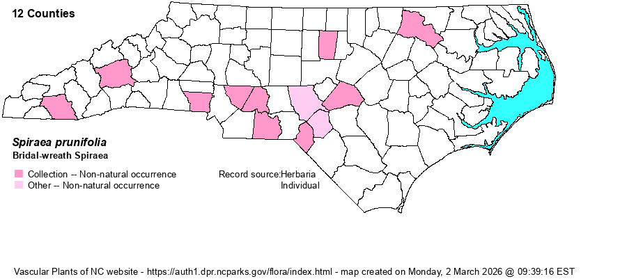 | Identification | Bridal-wreath Spiraea sends up one to several erect to leaning stems which are generally covered with small white flowers and very showy, early in spring, without leaves "getting in the way". The leaves arrive later, elliptical to ovate, 1-4 cm long. | |