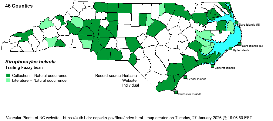 | Identification | This species and S. umbellata are quite similar, both being scattered across the state and both generally similar in appearance. Each is a slender trailing or weakly twining vine, reaching to 3-5 feet long. Each has trifoliate leaves; in this species the 3 leaflets are ovate and about 1.5-2 inches long and nearly as wide, but in this species there are usually two rounded side lobes, often only weakly developed. S. umbellata has un-lobed leaflets. Each has scattered clusters of just a few flowers in each, on very long and often erect stalks that reach 6-10 inches long, well beyond the leaves. The flower is usually bright rose to purple-rose, but can be pink to even whitish, about 1/2-inch across, with the standard upright and quite rounded, that gives each flower a circular shape. There are some characters in the bracts (bracteoles) of each species, but the main differences between the two are the leaflet shape -- mainly tri-lobed in S. helvola, which makes the leaflets wider, especially the terminal leaflet (which is more than 1 inch wide), versus an un-lobed set of leaflets and a narrower terminal leaflet (mostly 3/4-inch wide) in S. umbellata. For those who may be interested, S. helvola is an annual and S. umbellata is a perennial species. You won't have much trouble finding S. helvola along the coast, but finding it inland may be difficult, with much more likely chance of seeing it in the western Piedmont. Note that there are quite a few trailing legumes with 3 leaflets; the two Strophostyles leaflets tend to be larger than many (like Galactia) or a shinier and darker green (looking almost evergreen) than most others. Some observers may have to see flowers or fruit to be sure they are looking at a member of this genus. | |