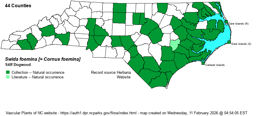 | Taxonomic Comments | Weakley (2020) names this genus as Swida, following recommendations of several recent references. This species’ scientific epitaph has waffled between stricta (e.g., RAB 1968) and foemina (older references and Weakley 2018). Most recent references use foemina.