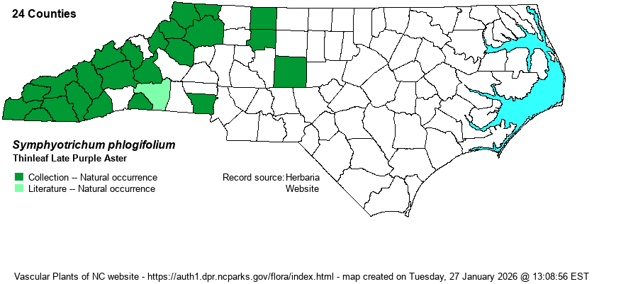 | Other Common Name(s) | Appalachian Clasping Aster. Though the most prevalent common name is Thinleaf Late Purple Aster, that leaves "Late Purple Aster" as a nested name, because that is the main common name of S. patens. However, no good common name is alternatively available for S. phlogifolium, and no references use Thinleaf Purple Aster. | |