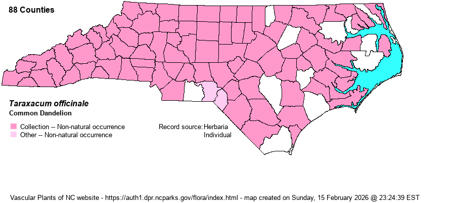 | Identification | Common Dandelion needs no introduction. See T. erythrospermum -- a very similar species that is easily overlooked; it has more strongly and narrowly dissected leaves. The fruiting "heads" are a favorite of kids to blow on to disperse the seeds. | |