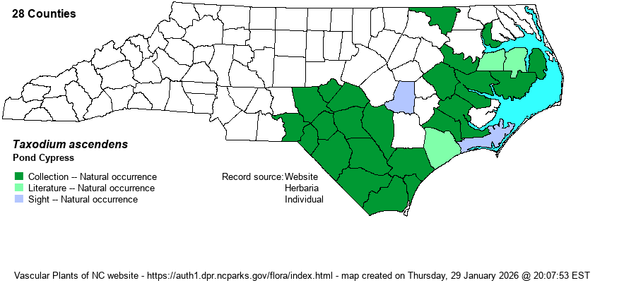 | Habitat | This is a species of standing or slowly moving blackwater areas – Carolina bays, limesink ponds, impoundments and beaver ponds, wet pocosins, and portions of blackwater floodplains, mostly in backswamps. It can occur with the very similar Bald Cypress (T. distichum), though that species has a wider habitat range, to also include brownwater swamps and more flowing waters. Some trees along some blackwater rivers, such as lower Drowning Creek and Lumber River, possess leaf features of both taxa (Sorrie, pers. obs.) and will not key cleanly. |