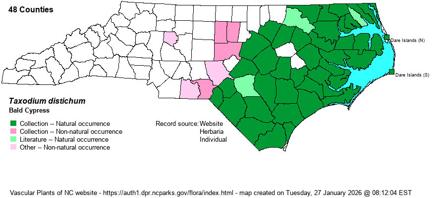 | Identification | This is a very familiar deciduous tree to nearly all NC citizens, and it is one of the taller conifers in the state, typically 80-100 feet tall. It is also long-lived, with a few trees in the Black River being cored at over 2600 years old. The trees have characteristic wide buttresses and conical knees sticking above the water level, though the very similar Pond Cypress (T. ascendens) does as well. Bald Cypress always has some, most, or nearly all of its leaves in a flat and linear shape, arranged distichously along a twig – the leaves are arranged in flat sprays (in a single plane), almost like a bird feather. Some leaves on younger twigs may be more linear and closely arranged tightly appressed to the stem, as in Pond Cypress. In that case, you need to look all over the tree, especially toward the top, to check for the “feather-like” arrangement of leaves. And, you may need to check several trees in a stand, just to be certain. Both species can occur together at a single lake or pond, or along a given river (such as the Lumber River), and thus care should be taken to properly identify the species. This species has slightly larger cones, typically about 1 inch across, than does Pond Cypress. See also notes under Pond Cypress. | |