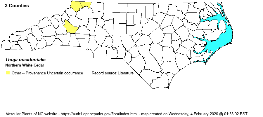 | Abundance | Uncertain if present now, or even formerly. If so, it likely is/was not native south to NC. The NCNHP status was recently changed (2021) from an appropriate SE? (Exotic?) to a more generic SU (Undetermined). It could just as easily be ranked as SR (Reported) or SRF (Reported Falsely). The editors do not believe this species has a place on the NC flora as a native species, and ranking it here as SU would indeed put it on such a list. | |
