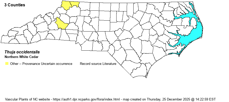 | Abundance | Uncertain if present now, or even formerly. If so, it likely is/was not native south to NC. The NCNHP status was recently changed (2021) from an appropriate SE? (Exotic?) to a more generic SU (Undetermined). It could just as easily be ranked as SR (Reported) or SRF (Reported Falsely). The editors do not believe this species has a place on the NC flora as a native species, and ranking it here as SU would indeed put it on such a list. | |