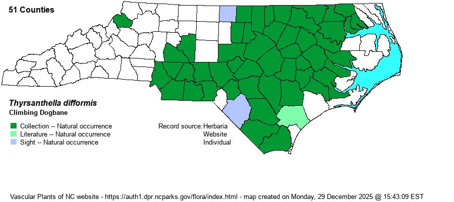 | Taxonomic Comments | This is another species that has been moved to a "new" genus in very recent times. It has or had long been named as Trachelospermum difforme, but Weakley (2018) and others have recently moved it to the genus Thyrsanthella, with a slight specific name change to difformis. Not that Thyrsanthella is easy to say, but it has "only" 13 letters and four syllables, as compared with 15 letters and five syllables in Trachelospermum!