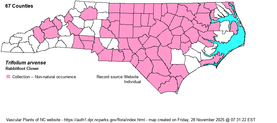 | Taxonomic Comments | Trifolium is a large genus of some 240-250 species globally, mostly north-temperate zone. Most are readily recognized as a clover by their 3 broad leaflets and globular to hemispherical head of densely-packed flowers. Flowers vary from white to pink, and red; the hop clovers have tiny yellow flowers. Some species were introduced for their forage value for livestock, others hitched a ride with hay, packing material, etc. Our two native species -- T. carolinianum and T. reflexum -- have suffered great loss of habitat and are now rare. | |