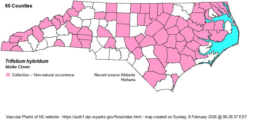 | Taxonomic Comments | Trifolium is a large genus of some 240-250 species globally, mostly north-temperate zone. Most are readily recognized as a clover by their 3 broad leaflets and globular to hemispherical head of densely-packed flowers. Flowers vary from white to pink, and red; the hop clovers have tiny yellow flowers. Some species were introduced for their forage value for livestock, others hitched a ride with hay, packing material, etc. Our two native species -- T. carolinianum and T. reflexum -- have suffered great loss of habitat and are now rare. | |