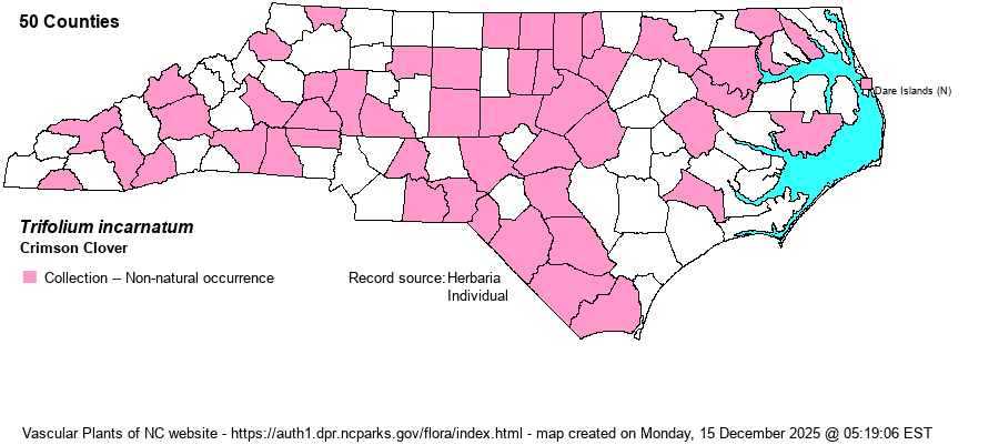 | Identification | Crimson Clover is robust, usually multi-stemmed, and reaches 1.5 feet tall. The leaflets are broad. The flowers are deep red or crimson, in an elongate inflorescence. | |